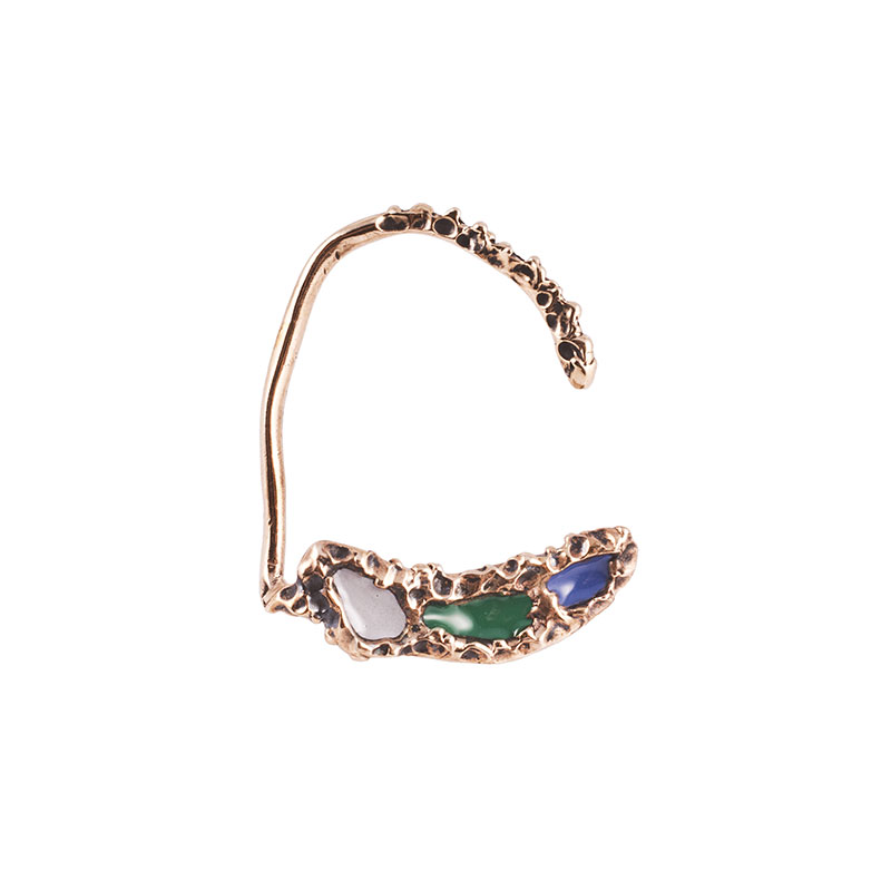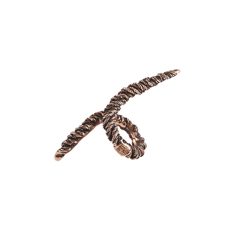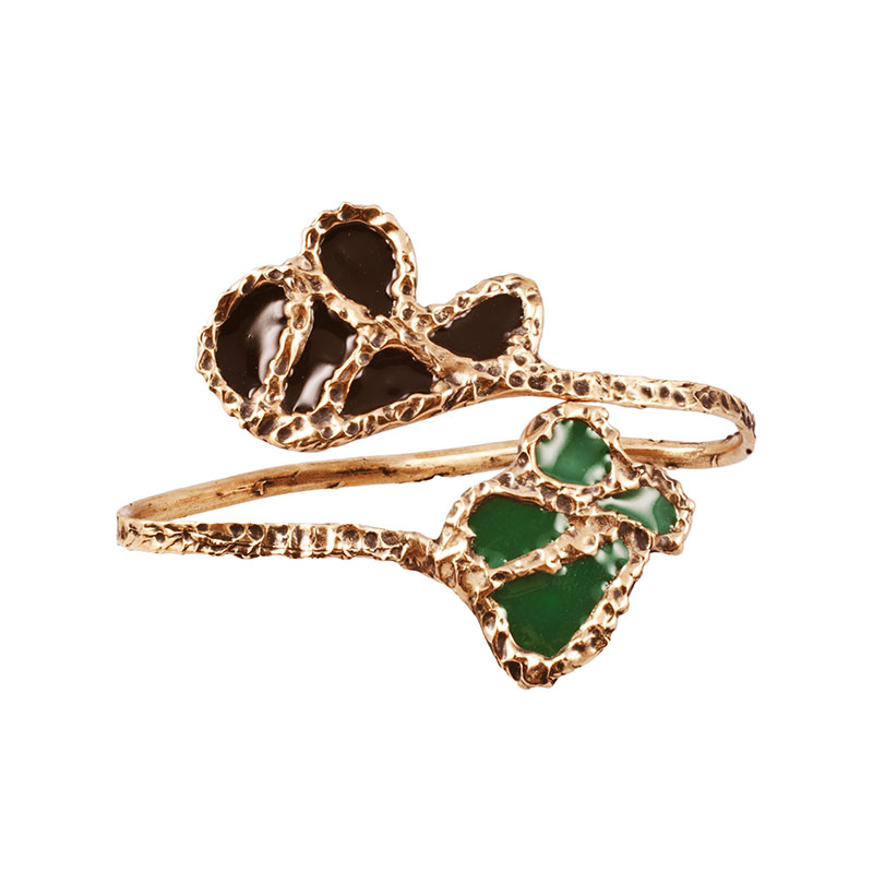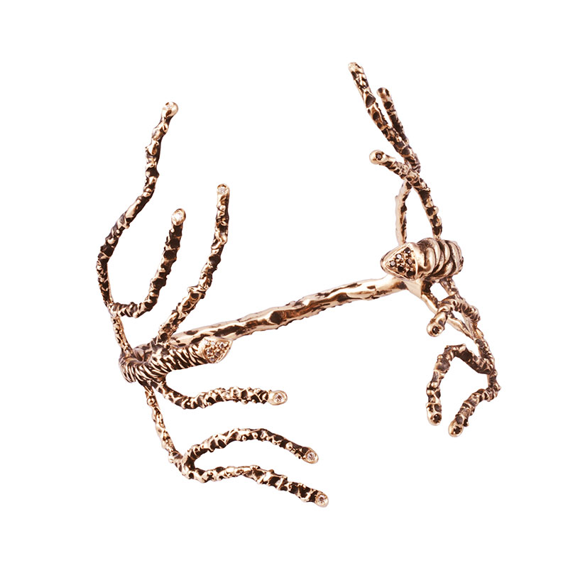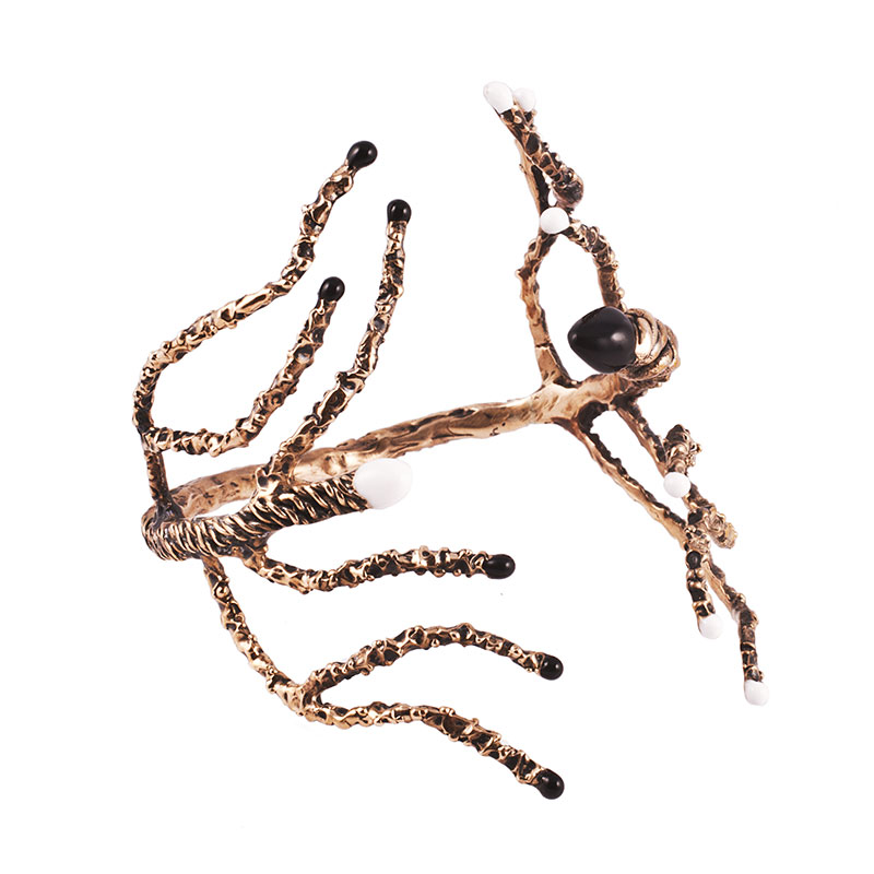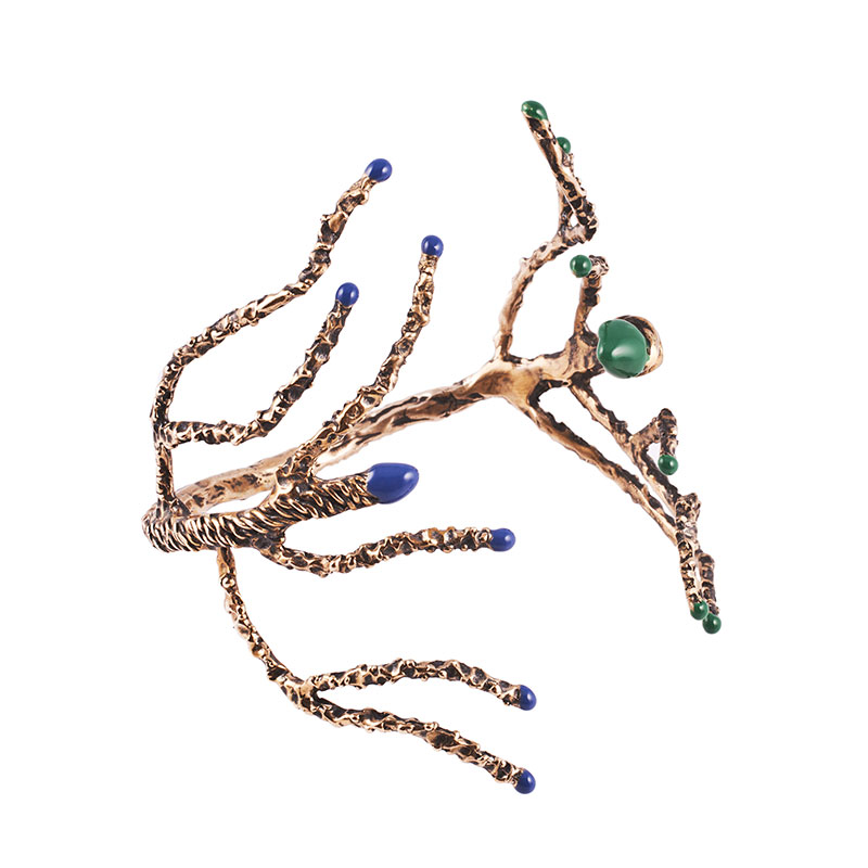 Microcosmi selvatici e lussureggianti, rêveries di gusto esotico e cenni Déco per “Creepers”, la collezione FW 14.15 di Flaminia Barosini. Una collezione dall’estetica composita che mescola elementi organici e cromie cangianti dal forte impatto visivo. Un rigoglio fatto di intrecci, fibre e steli che ricorre nei chocker dalle linee essenziali, negli originali ear cuff, nell’iconico anello mustache rivisitato attraverso nuove trame e smalti policromi dai toni squillanti mentre i bangle multifilo avviluppano i polsi come sottili liane d’edera.