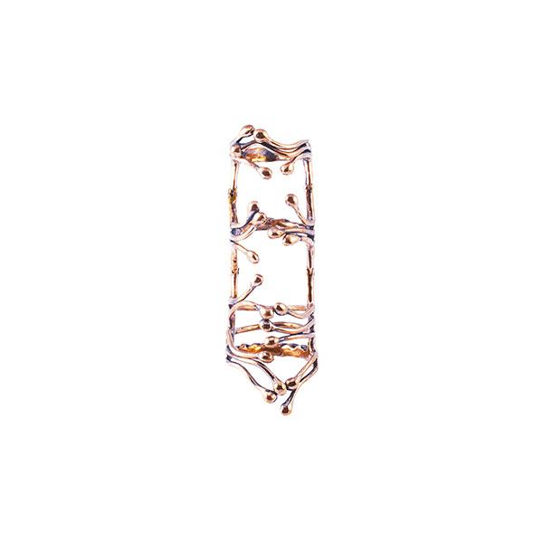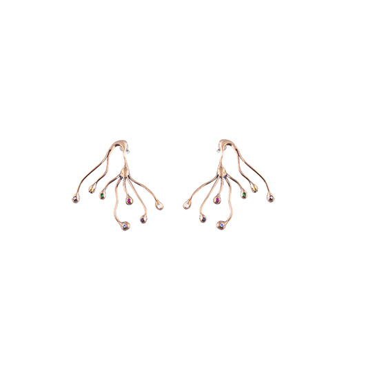 Trame amniotiche e alchimie materiche delineano la collezione Origins. Il risultato è un personalissimo alfabeto, onirico e visionario, che dà luogo ad eclettici anelli e ciondoli le cui linee fluide e sinuose divengono lo spunto per una riflessione dai tratti freudiani sugli istinti più profondi e ancestrali dell’uomo che ricorre anche negli iconici ear cuff e nei chocker dal mood minimale, illuminati da vivaci e inedite vibrazioni cromatiche conferite da pietre preziose e semipreziose.